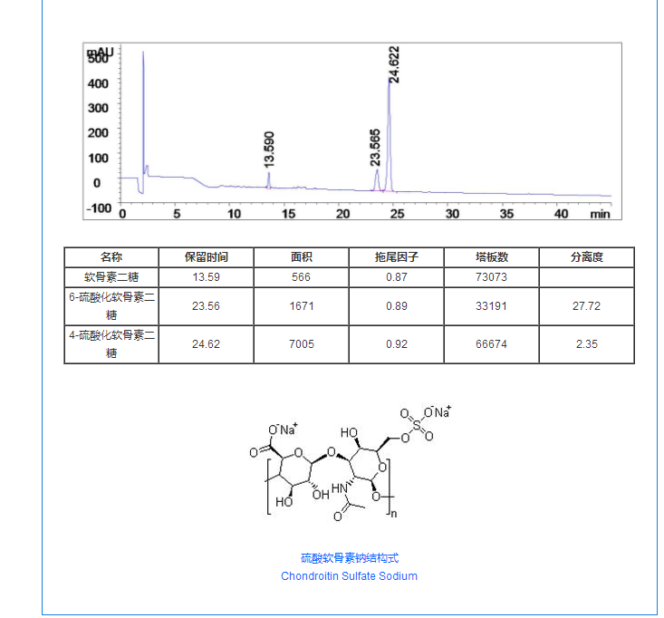 硫酸軟骨素鈉專用柱ME-SAX(L)是以高純度具有良好機械穩定性的硅膠為基質,通過使用高純度鍵合試劑在硅膠上鍵合季銨強陰離子交換基團而得到。在藥典色譜條件下的分離過程中,對軟骨素二糖、6-硫酸化軟骨素二糖、4-硫酸化軟骨素二糖的分離度******滿足藥典要求。